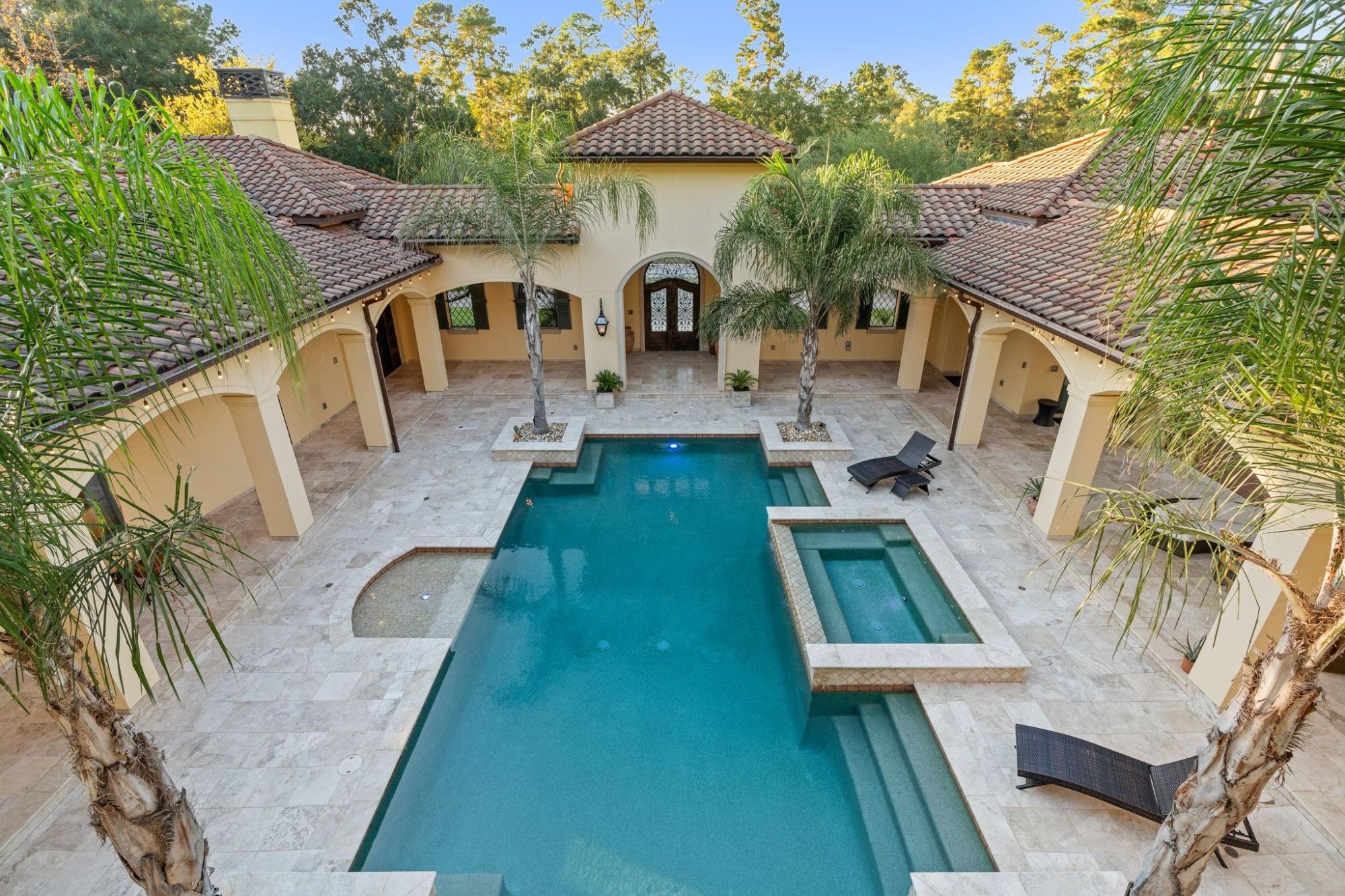 Outside, a resort-style courtyard pool with cascading fountains anchors the estate grounds — a private sanctuary unlike anything else in Montgomery County, TX.