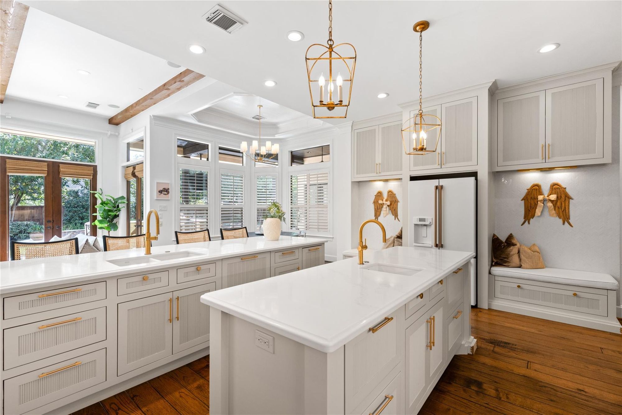 Inside this home is an open family room with exposed beams, fireplace, and triple set of french doors for indoor/outdoor living; a fully renovated kitchen with fluted panel cabinetry and brass accents, a formal living room with views of the pool, and a spa-like primary suite with James Martin vanities, fluted marble accent walls, and designer touches throughout.
