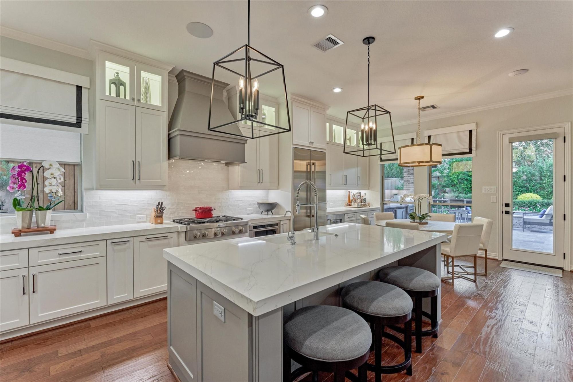The interior of this home looks like it belongs in a magazine, with warm hardwood flooring, elegant iron spindles on the staircase, a dining room with designer wall paper and light fixture, open concept living room and kitchen with exposed beams and shiplap accents, and a dream backyard with a huge pool and outdoor kitchen.