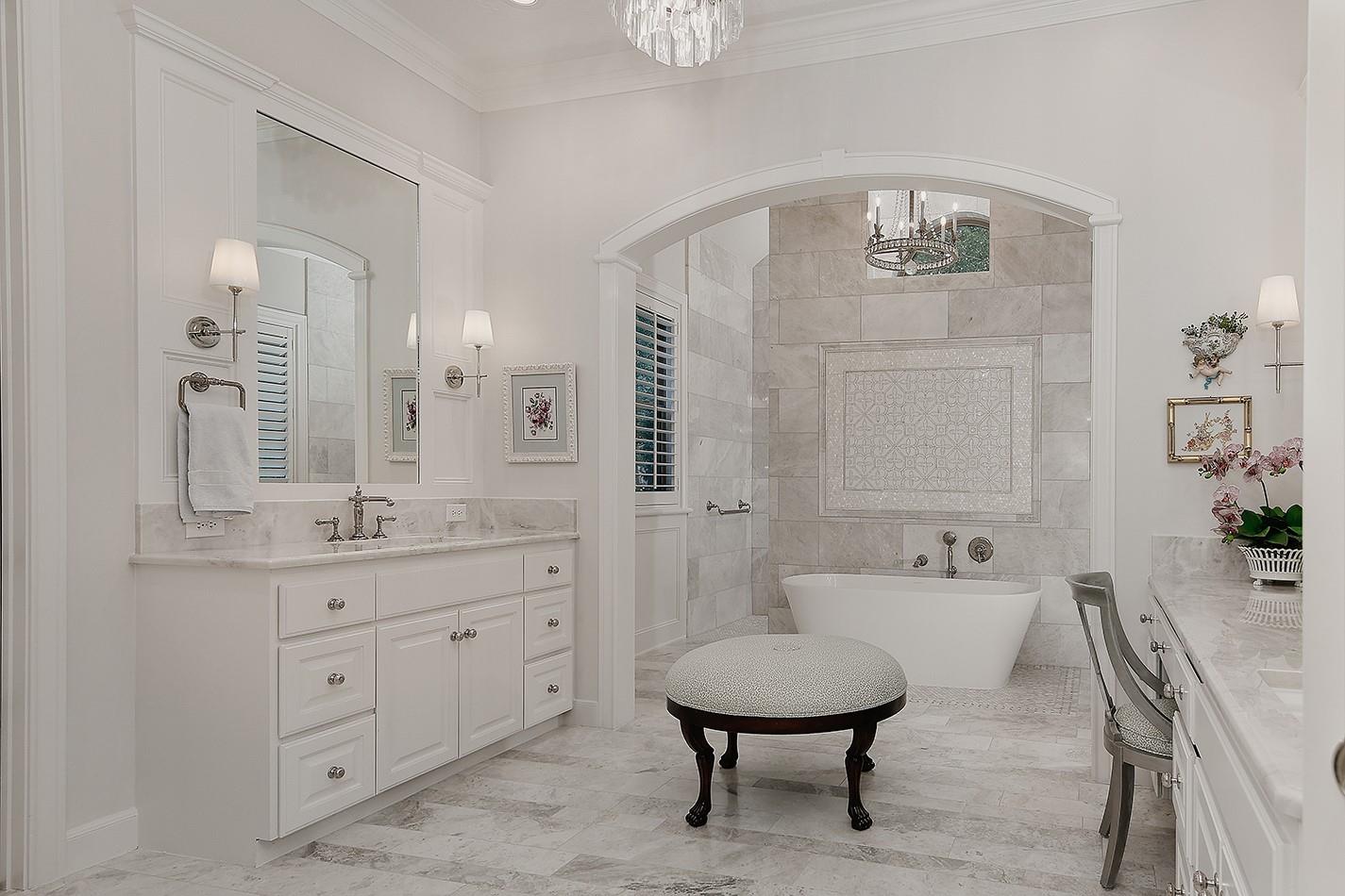 The plumbing has been repiped with PEX piping, kitchen updated with thick granite countertops and new light fixtures, the formal dining features a refrigerated wine wall, and the primary bathroom was updated with marble flooring and walls, Victoria & Albert tub, and an elegant tile inlay on the shower wall.