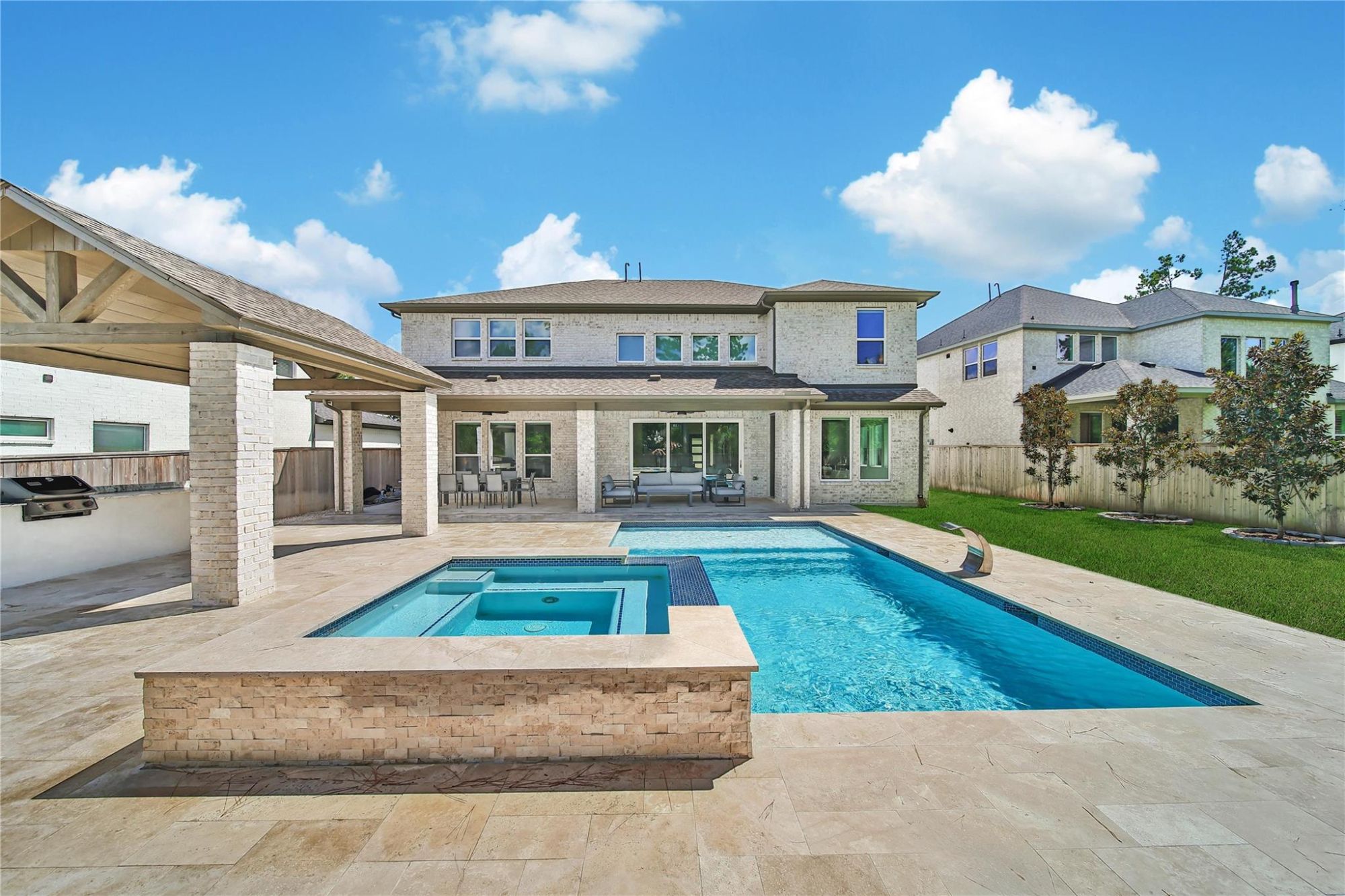The backyard features a sparkling pool and spa, extended covered patio, and a custom pavilion with an outdoor kitchen.
