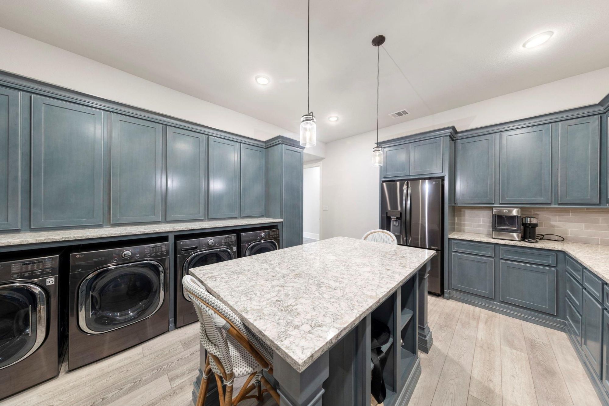 The bathroom is like your own private retreat with marble tile flooring with basketweave mosaic inset tile that flow up along the shower wall, standalone soaking tub, and a huge shower; and the largest laundry room you'll probably ever see with dual sets of washers and dryers, a large island, and an abundance of cabinetry and countertop space.