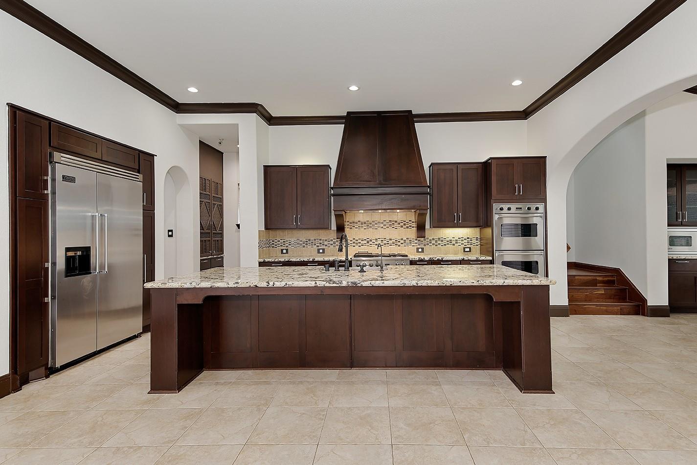 This modern stone and stucco home features 5 bedrooms, 5 full bathrooms and 3 half bathrooms, metal roof, pavered driveway and oversized 4-car garage, two-story formal dining space, an entertainers corner with Termador wine fridge, built-in ice maker, and walk-in storage room.